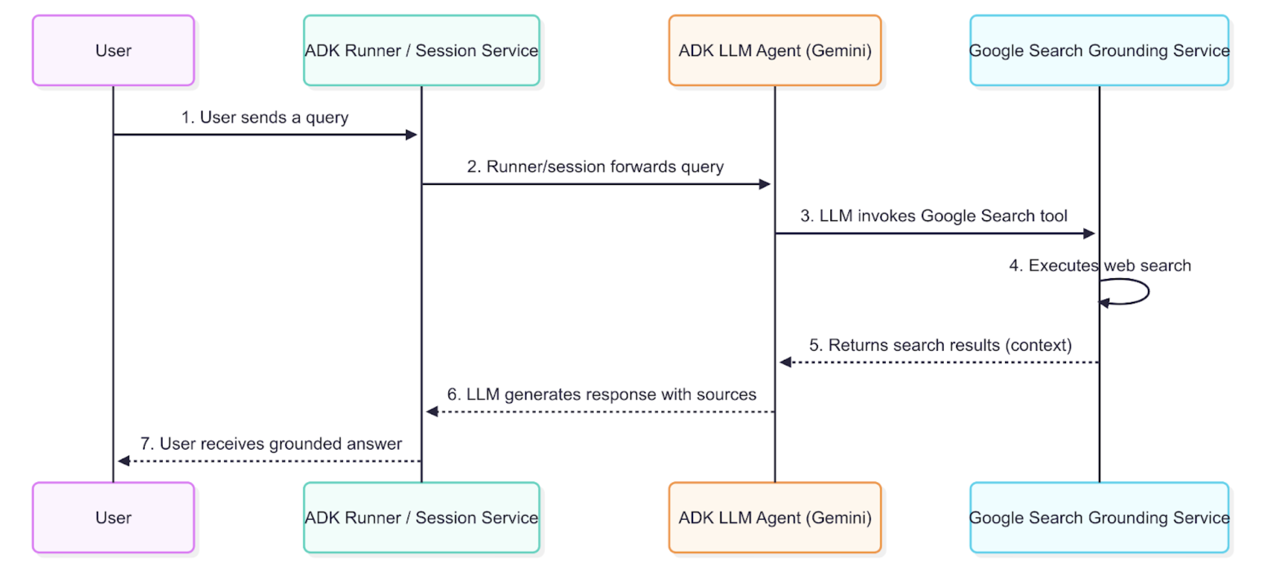 - 帶來源的回應呈現:ADK 會接收最終的知識接地回應,其中包含必要的來源 URL 及
